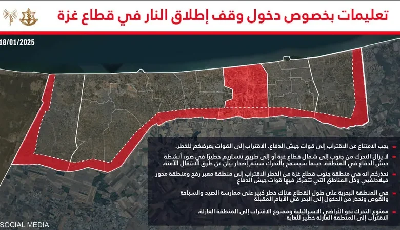 نشر المتحدث باسم الجيش الإسرائيلي أفيخاي أدرعي خريطة لأماكن قال إنه ممنوع على الفلسطينيين الاقتراب منها، وذلك عشية دخول اتفاق وقف إطلاق حيز التنفيذ، بحسب “سكاي نيوز عربية”.